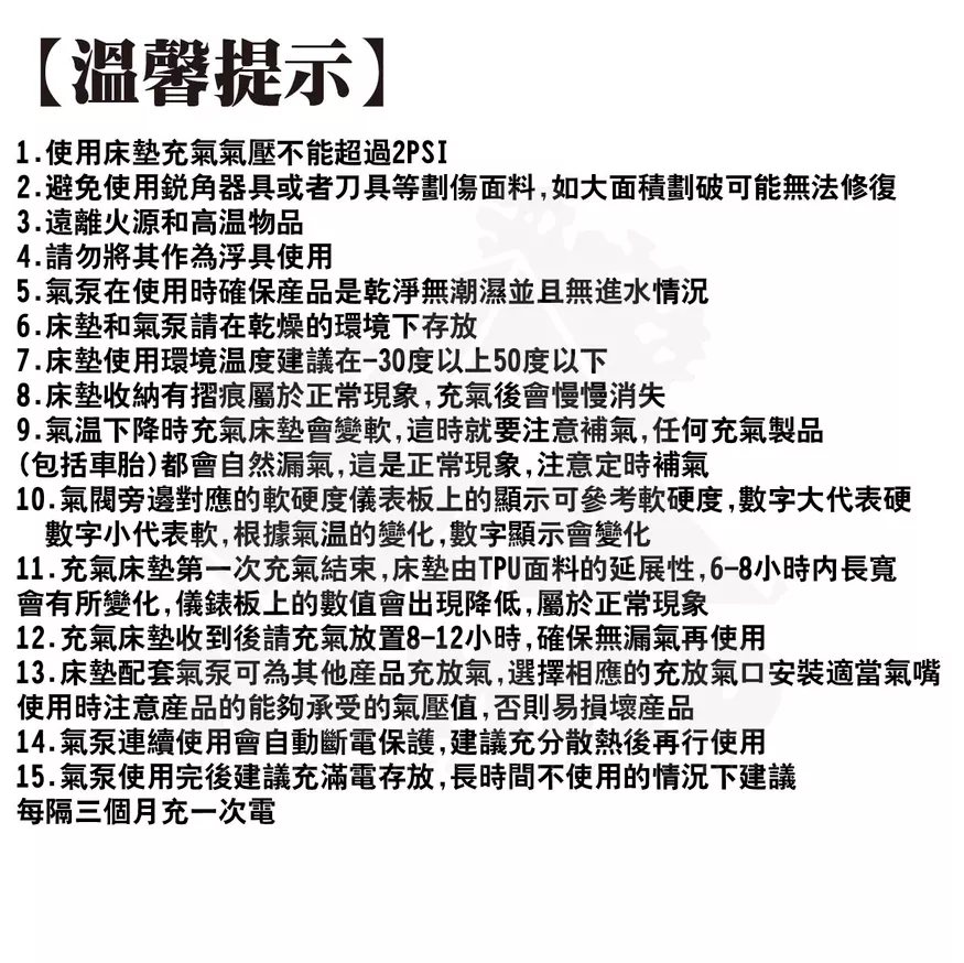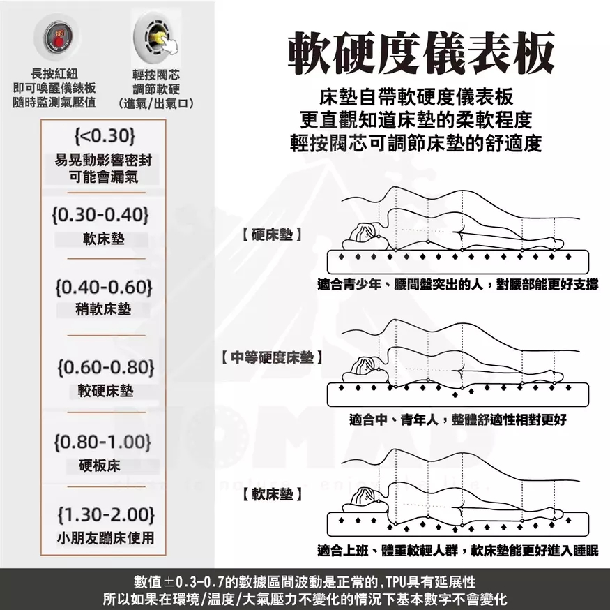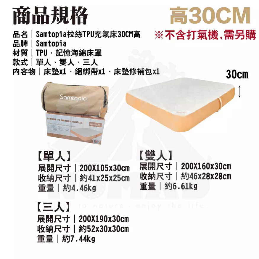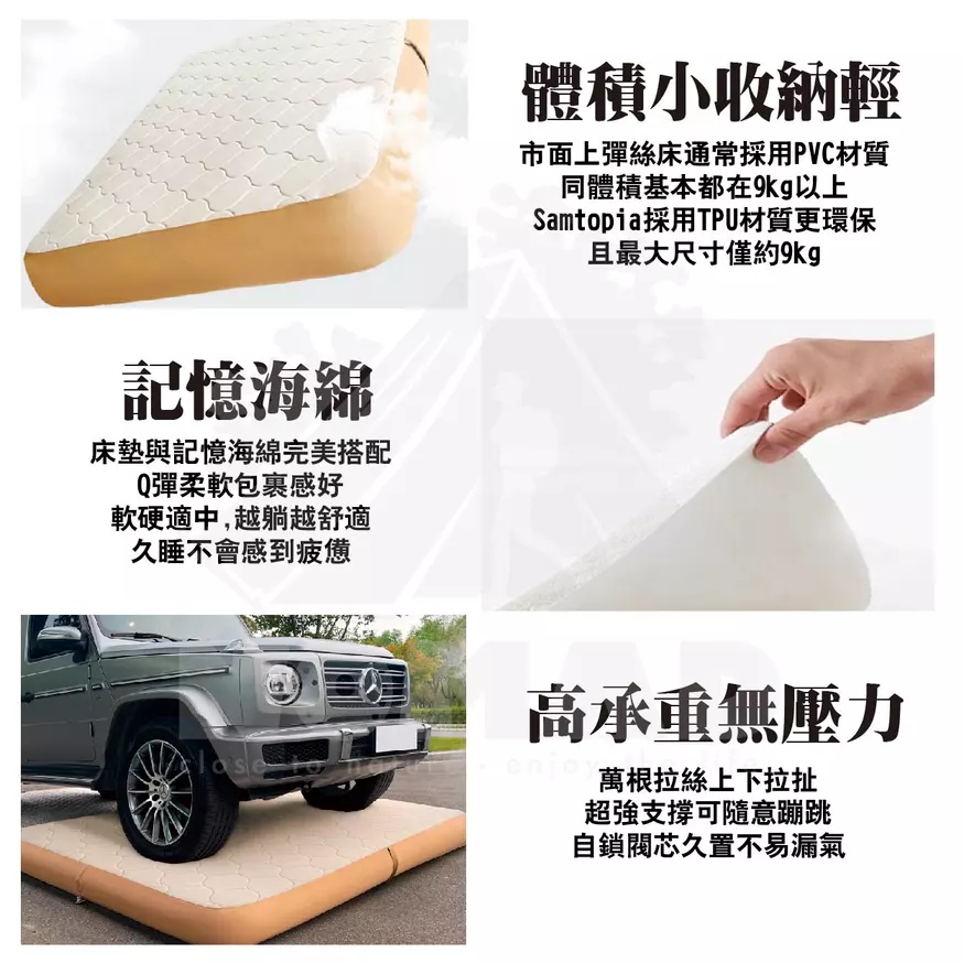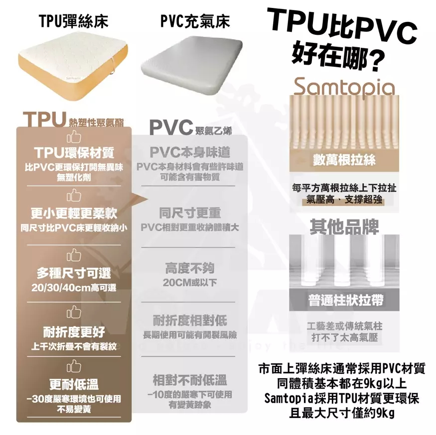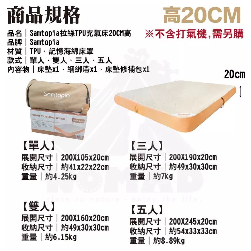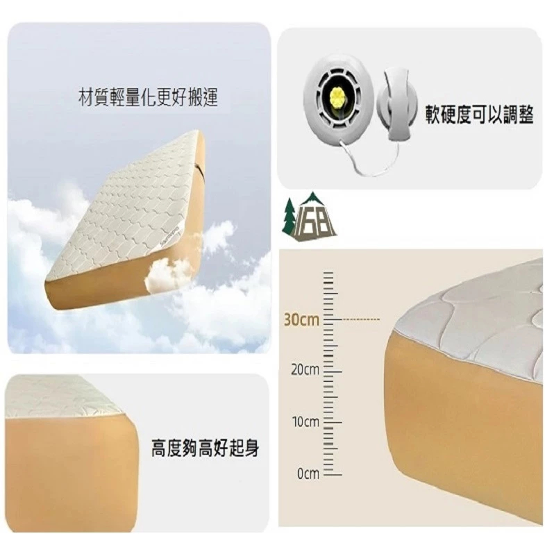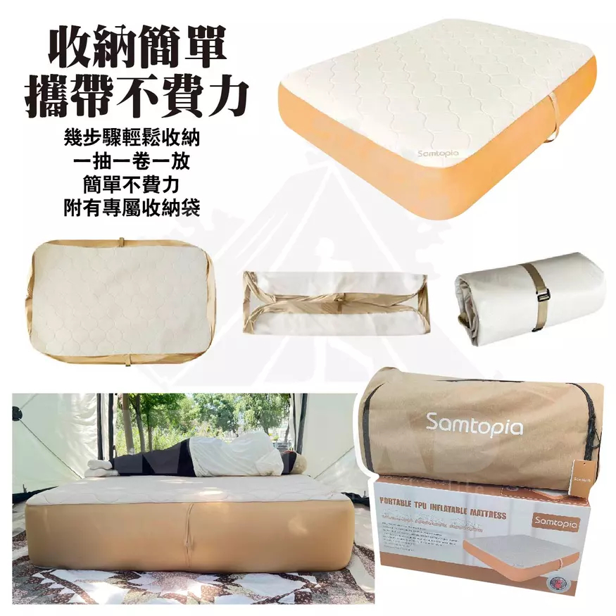 床墊與記憶海綿完美搭配Q彈柔軟包裹感好,軟硬適中,越躺越舒適久睡不會感到疲憊萬根拉絲上下拉扯超強支撐可隨意蹦跳,能承重約500kg,自鎖閥芯久置不易漏氣床墊自帶軟硬度儀表板更直觀知道床墊的柔軟程度,輕按閥芯可調節床墊的舒適度註:數值±0.3-0.7的數據區間波動是正常的,TPU具有延展性,所以如果在環境/溫度/大氣壓力不變化的情況下基本數字不會變化加厚0.8cm記憶海綿床墊更柔軟更舒適,戶外的和家裡一樣舒適註:記憶海綿不建議水洗,可能會收縮,建議乾洗的方式,使用吸塵器的軟刷頭輕輕吸塵去除表面灰塵和汙垢,對於局部汙漬可以使用濕布輕輕擦拭,但務必確保擦拭後讓產品完全乾燥一床多用,居家休息臨時加床、戶外露營輕鬆應對加高設計更加防潮,釋壓緩震,床墊更飽滿幾步驟輕鬆收納,一抽一卷一放,簡單不費力,附有專屬收納袋新品瑕疵保固:收到床墊後務必充氣靜置8-12小時,確認有無漏氣之嫌疑,儀錶板數值±0.3-0.7之間屬於正常範圍----------------------------------【注意事項】1.使用床墊充氣氣壓不能超過2PSI2.避免使用銳角器具或者刀具等劃傷面料,如大面積劃破可能無法修復3.遠離火源和高溫物品4.請勿將其作為浮具使用5.氣泵在使用時確保產品是乾淨無潮濕並且無進水情況6.床墊和氣泵請在乾燥的環境下存放7.床墊使用環境溫度建議在-30度以上50度以下8.床墊收納有摺痕屬於正常現象,充氣後會慢慢消失9.氣溫下降時充氣床墊會變軟,這時就要注意補氣,任何充氣製品(包括車胎)都會自然漏氣,這是正常現象,注意定時補氣10.氣閥旁邊對應的軟硬度儀表板上的顯示可參考軟硬度,數字大代表硬數字小代表軟,根據氣溫的變化,數字顯示會變化11.充氣床墊第一次充氣結束,床墊由TPU面料的延展性,6-8小時內長寬會有所變化,儀錶板上的數值會出現降低,屬於正常現象12.充氣床墊收到後請充氣放置8-12小時,確保無漏氣再使用13.床墊配套氣泵可為其他產品充放氣,選擇相應的充放氣口安裝適當氣嘴使用時注意產品的能夠承受的氣壓值,否則易損壞產品14.氣泵連續使用會自動斷電保護,建議充分散熱後再行使用15.氣泵使用完後建議充滿電存放,長時間不使用的情況下建議每隔三個月充一次電【商品規格】品名|Samtopia拉絲TPU充氣床10CM高-車中床品牌|Samtopia材質|TPU、記憶海綿床罩展開尺寸|約195x130x10cm收納尺寸|約48x22x22cm重量|約3.7kg------------品名|Samtopia拉絲TPU充氣床10CM高【無儀表盤】品牌|Samtopia材質|TPU、記憶海綿床罩款式|單人展開尺寸|200X72X10cm (行軍床)收納尺寸|約41x24x24cm重量|約2.9kg內容物|床墊x1、綑綁帶x1、床墊修補包x1------------品名|Samtopia拉絲TPU充氣床20CM高品牌|Samtopia材質|TPU、記憶海綿床罩款式|單人、雙人、三人、五人內容物|床墊x1、綑綁帶x1、床墊修補包x1------------品名|Samtopia拉絲TPU充氣床30CM高品牌|Samtopia材質|TPU、記憶海綿床罩款式|單人、雙人、三人內容物|床墊x1、綑綁帶x1、床墊修補包x1------------品名|Samtopia拉絲TPU充氣床40CM高品牌|Samtopia材質|TPU、記憶海綿床罩款式|雙人、三人內容物|床墊x1、綑綁帶x1、床墊修補包x1 -